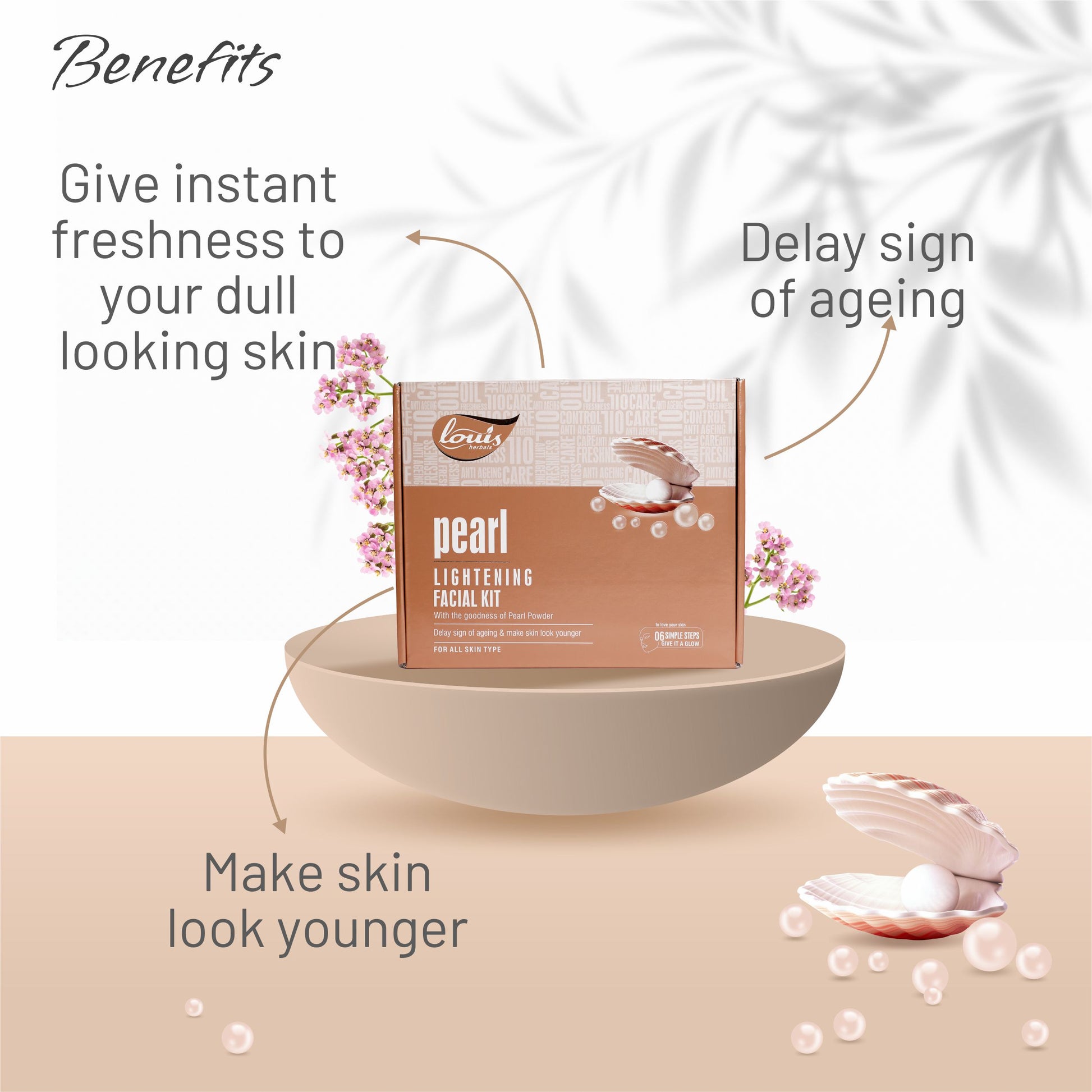 PEARL FACIAL KIT Delay sign of aging and makes skin younger looking Pearl Facial are enriched with pearl powder that works wonder on your skin and helps you get glowing, shiny skin. It helps in delaying sign of aging and give instant freshness to your dull-looking skin. So bring life to your skin by opting for this Pearl Facial Kit.